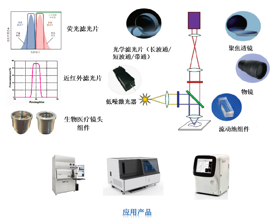 公司能提供各类光学元器件,如光学滤光片(长波通/短波通/带通)、偏振分束器,各类透镜、装配件、激光光源等,应用于激光眼科治疗设备、OCT、流式细胞仪、DNA测试仪等医疗仪器。
