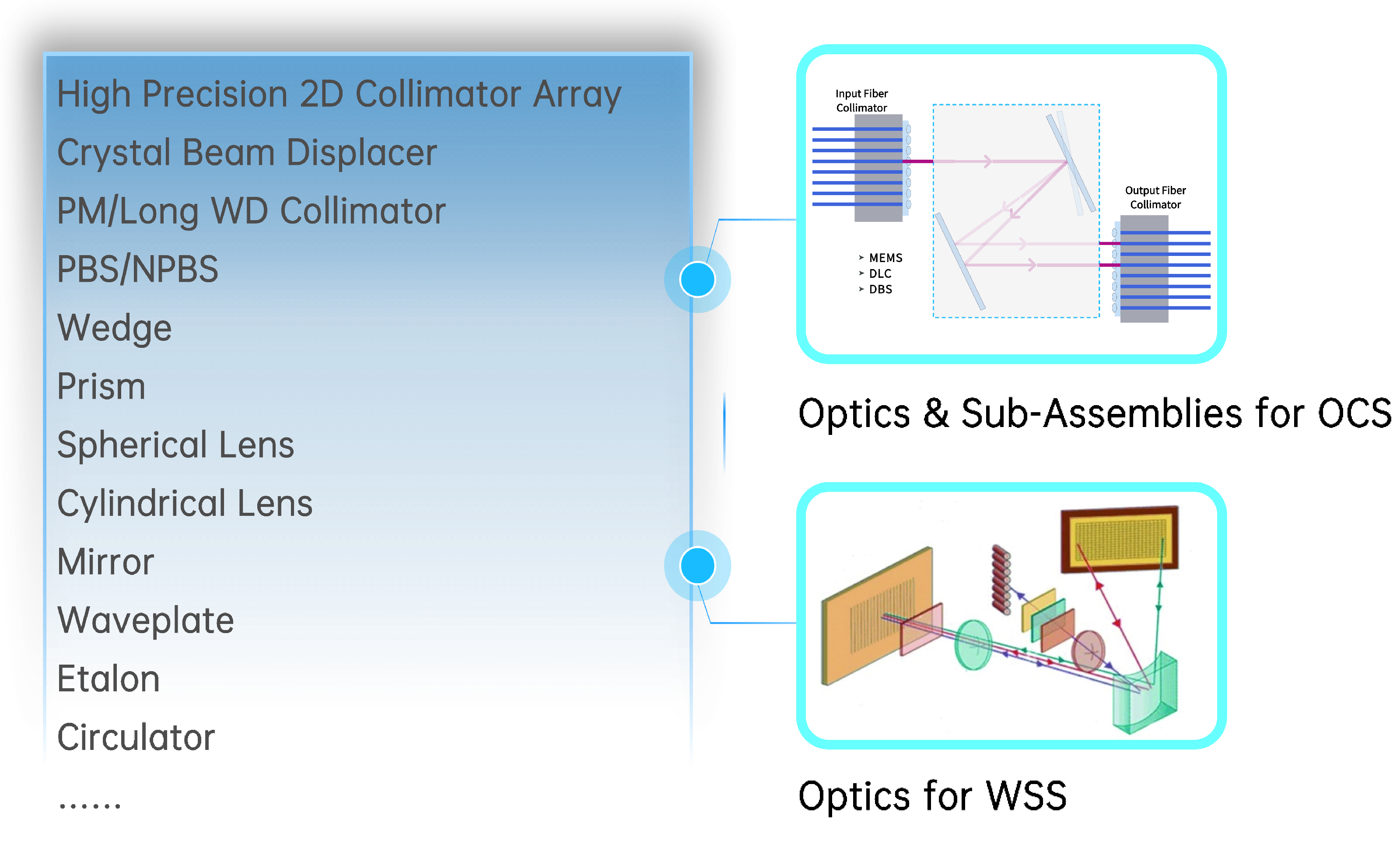 Optowide offers a full range of optical components and fiber optic devices used in transceiver optical modules. These mainly consist of various optical components such as filters, polarizing beam splitters (PBS), non-polarizing beam splitters (NPBS), prisms, lenses, and aspheric lenses, as well as fiber optic devices including circulators, collimators, wavelength combining and splitting modules, and optical multiplexers.